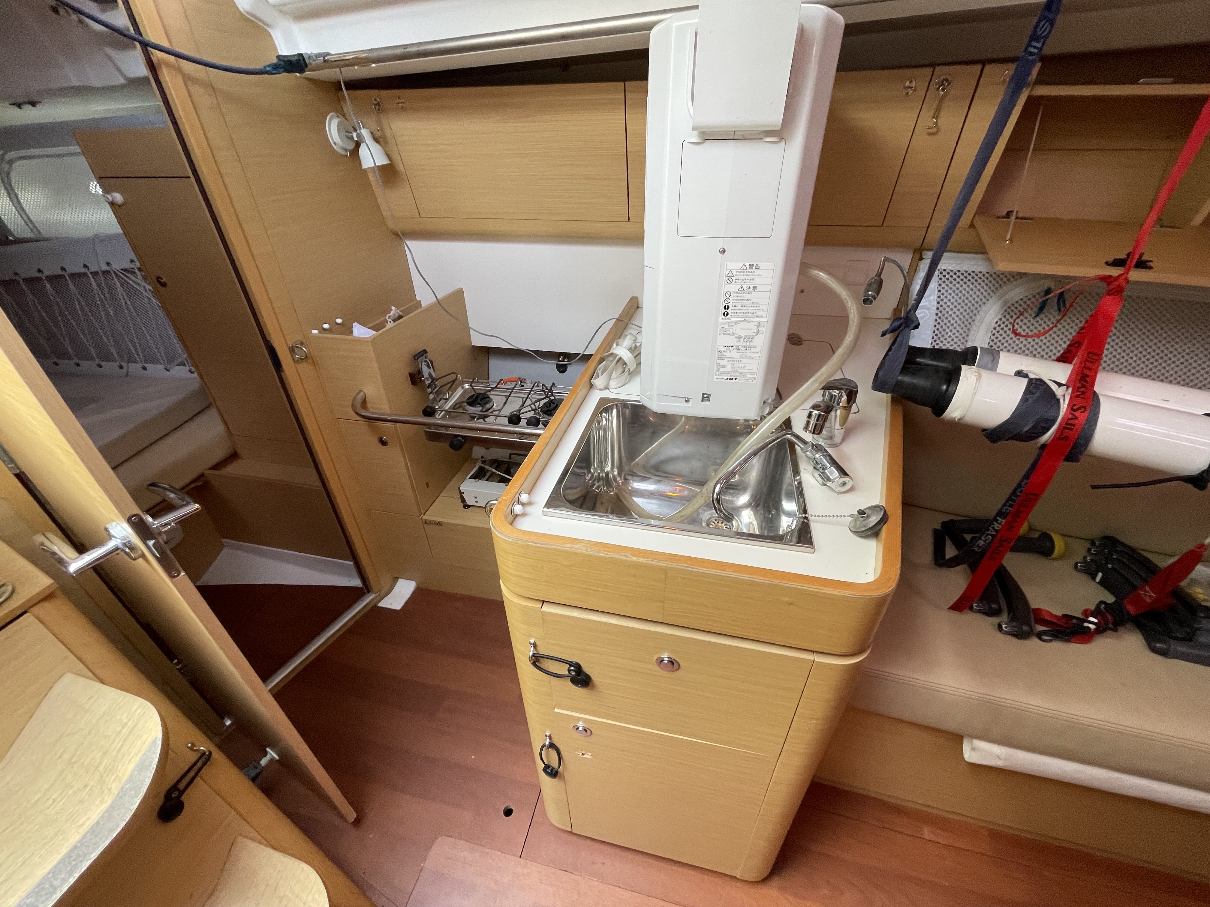 ギャレー、カセットコンロ、冷蔵庫、手動トイレ